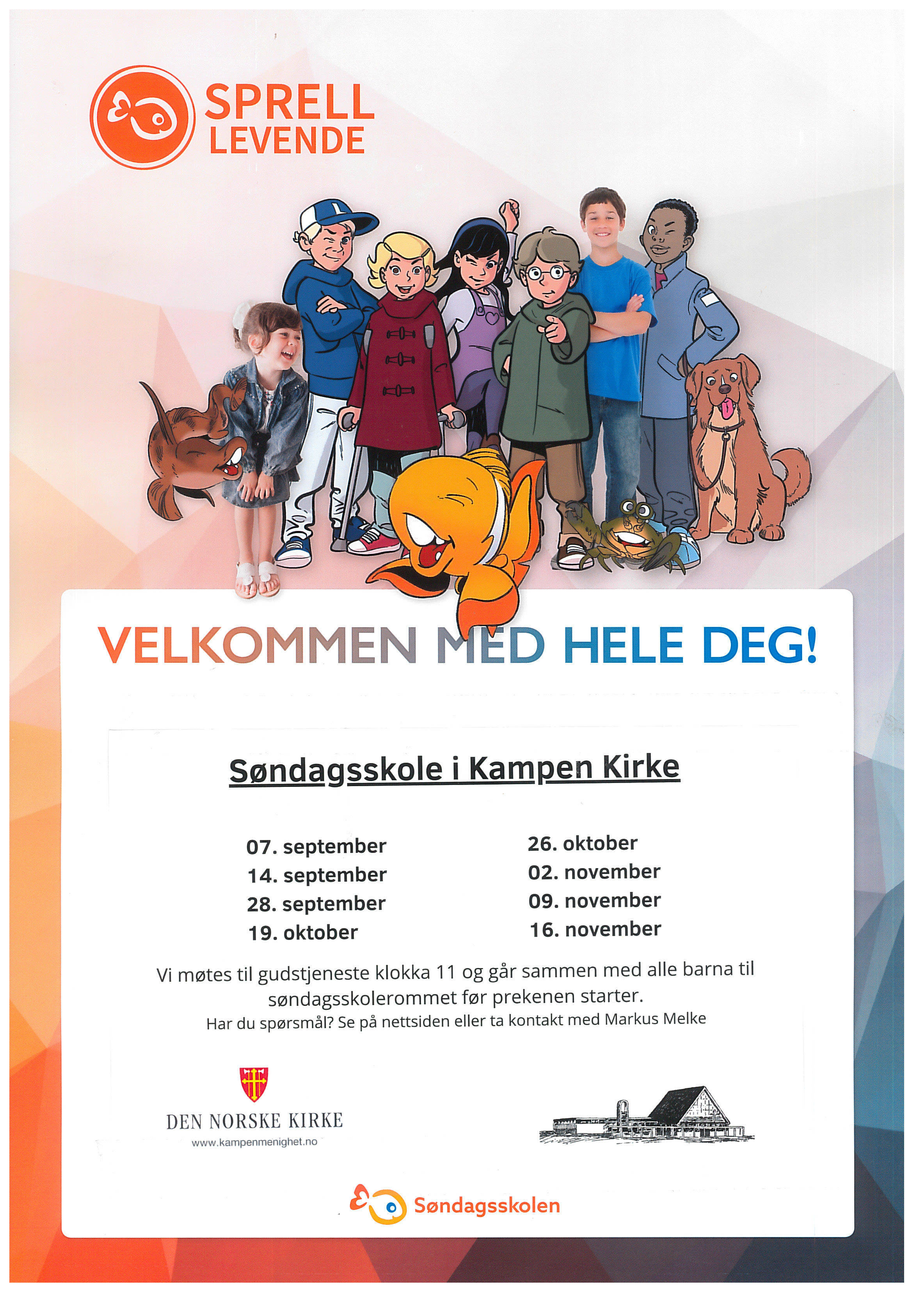 Kampen søndagsskole møtes til gudstjenesten kl. 11, og går ut under prekenen. Vi synger, forteller en bibelfortelling og har ulike aktiviteter. Vel møtt!